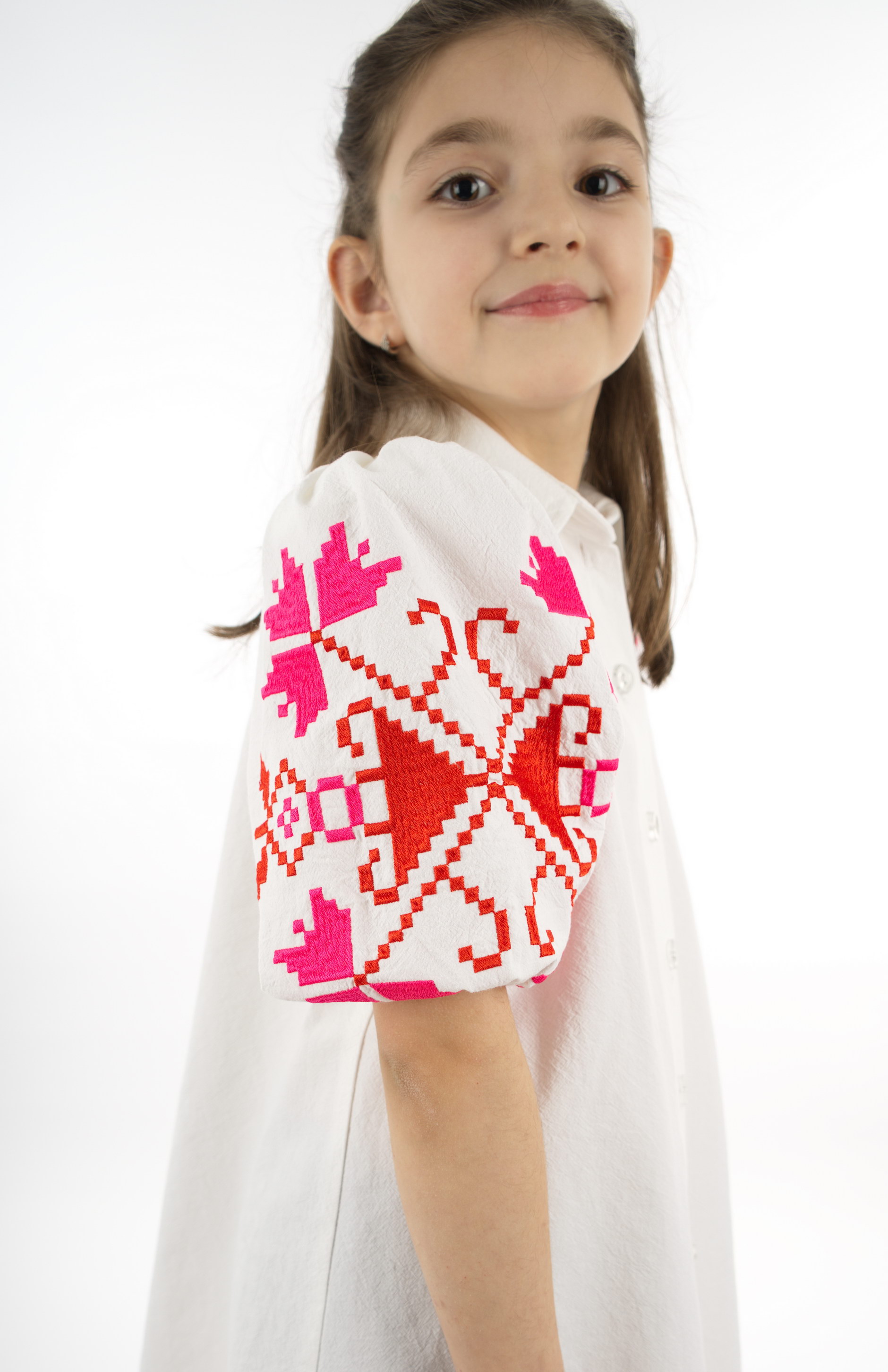 Rochie tip cămașădin 100% pânză topită, din bumbac de cea mai bună calitate, cu un tușeu catifelat, cu mâneci oversized, brodate cu motive tradiționale bucovinene.