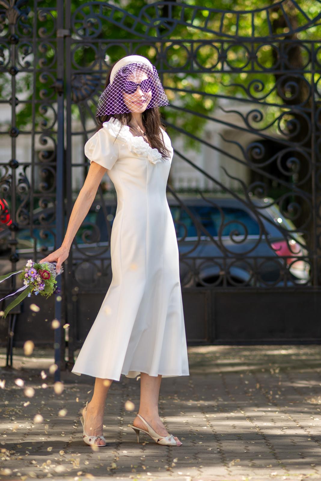 Model amplu cu mânecă stilizată in formă de trandafir, realizat din tafta si accesorizata cu trandafiri textili realizati manual.